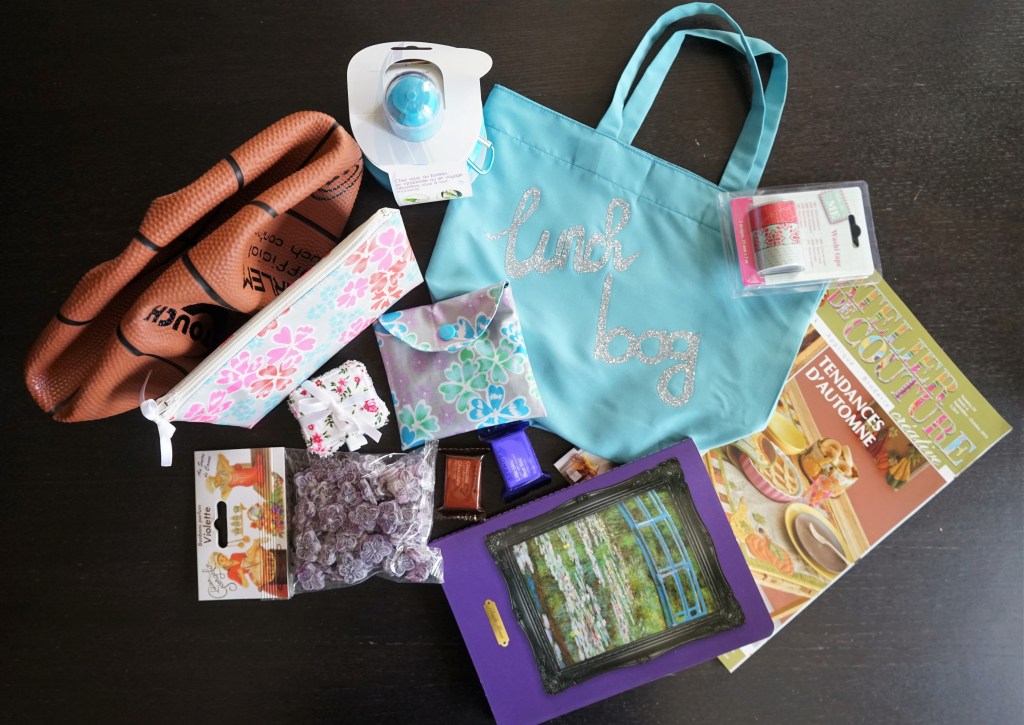 Le temps me manquant cruellement, mon colis allait contenir moins de produits faits-main. Mais je me suis appliquée sur la réalisation des quelques créations destinées à Carole. Ainsi, le paquet qui est parti en gironde contenait une trousse et une petite pochette en coton enduit Petit Pan, des carrés de coton réutilisables, un lunch-bag, une gourde pliable, un ballon de basket (la liste de Linda m’a été utile pour savoir sur quel sport miser), un magazine de patchwork, un cahier, du masking tape, des pastilles effervescentes pour le bain et des violettes de Toulouse.