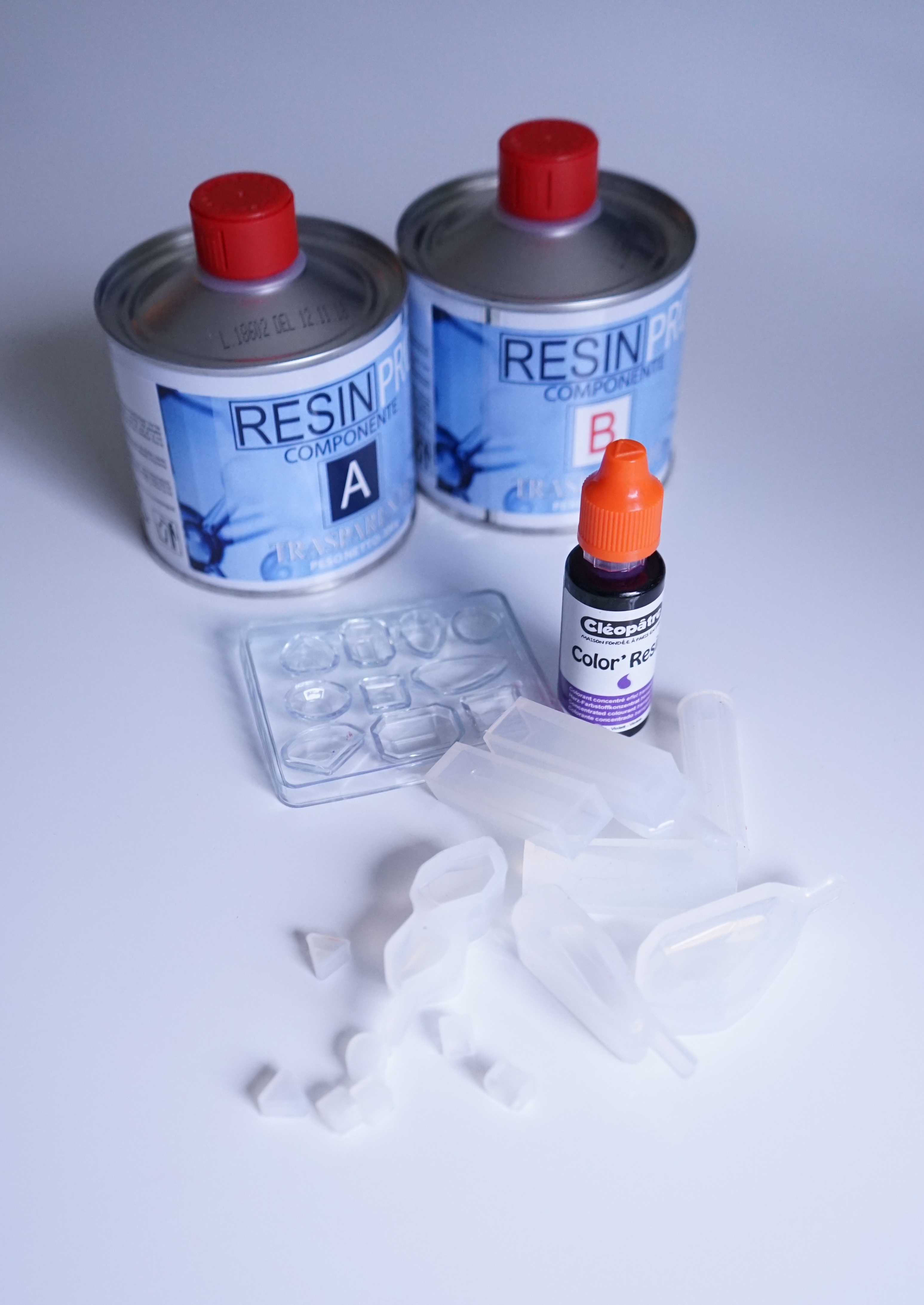 Après avoir entrevu le champ des possibilités, j’ai finalement sauté le pas et commandé tout le nécessaire pour faire un essai: un kit de résine Epoxy bi-composants, des moules en silicone et un peu de colorant.
